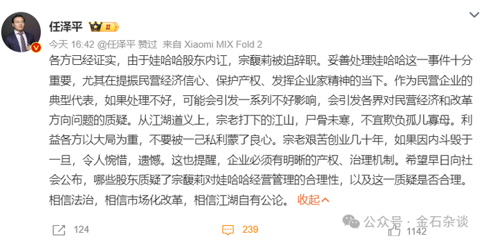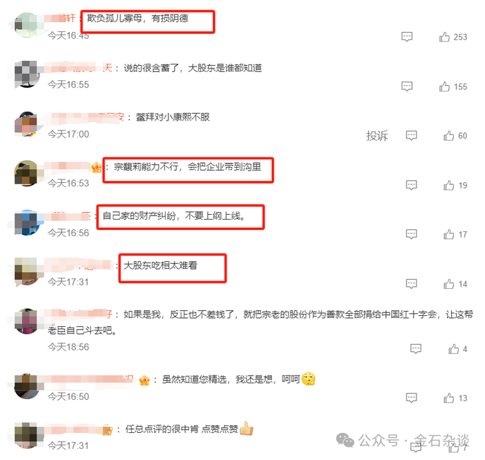对于任泽平点评,有三种观点:一是自家的财产纠纷,不要上纲上线,怎么就和民营经济信心联系起来了;二是说的很含蓄了,大股东是谁都知道;三是宗馥莉能力不行。