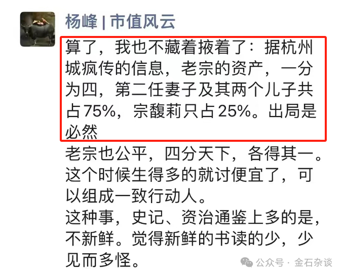 4)第四个原因,就是知名自媒体平台市值风云董事长杨峰的爆料:他说也不藏着掖着了:据杭州城疯传的消息,老宗的资产,一分为四,第二任妻子及其两个儿子共占75%,宗馥莉只有25%,出局是必然。