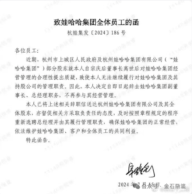 昨日上午,一张截图刷屏,说是宗馥莉因遭到部分股东质疑,致使其无法继续履行娃哈哈的管理职责,自7月15日辞去副董事长、总经理职务,不再参与其经营管理。