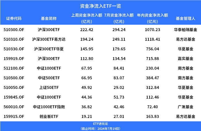 四只沪深300ETF上周合计净流入资金超675亿元,华泰柏瑞沪深300ETF净流入额高达222.42亿元;易方达沪深300ETF、华夏沪深300ETF、嘉实沪深300ETF净流入额超百亿元,分别为194.24亿元、145.95亿元、112.80亿。南方中证500ETF、南方中证1000ETF净流入均超60亿元。