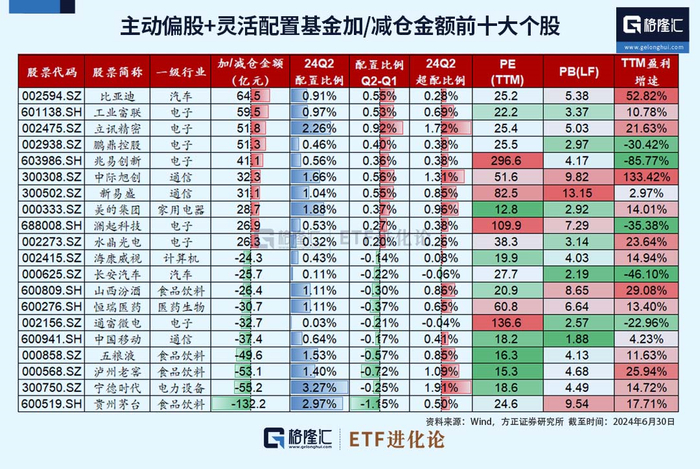 加仓金额前十股票中,有6只属于电子行业,2只属于通信行业,另外2只分别汽车和家用电器。其中,比亚迪加仓金额最高,加仓约64.5亿元,工业富联紧随其后,加仓约59.5亿元。