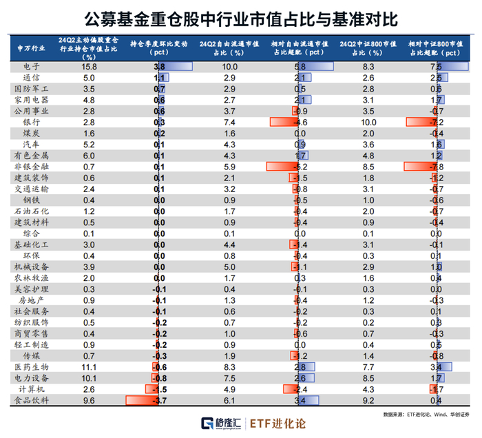 从持仓市值占比的环比变动看,24Q2公募加仓前五行业:电子(持仓市值占比提升3.8%)、通信(1.1%)、军工(0.7%)、家电(0.6%)、公用(0.6%);减仓前五行业:食饮(-3.7%)、计算机(-1.5%)、电力设备(-0.8%)、医药(-0.6%)、传媒(-0.3%)。