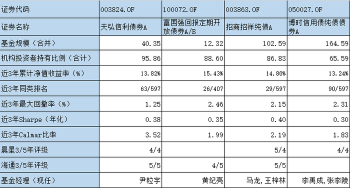 业绩及排名:银河证券,天弘信利债券A、招商招祥纯债A和博时信用债纯债债券A为长期纯债债券型基金(A类),富国强回报定期开放债券A/B为定开纯债债券型基金(A类) ;