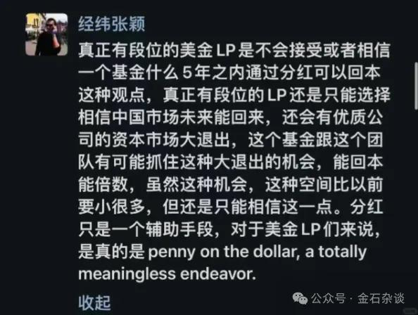 当时张颖还表达了反对意见,真正有段位的美金LP是不会接受或者相信一个基金5年之内通过分红回本的观点,真正有段位的LP还是只能选择相信中国市场未来能回来,还会有优质公司的资本市场大退出。他表示,分红只是一个辅助手段,对于美金LP来说分红属于廉价出售,纯粹没有意义的努力。