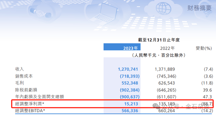 调整后净利润来看,该公司分别净亏损4.45亿、盈利9348万、盈利1.35亿元以及盈利0.15亿,2023年利润下滑了88.7%。
