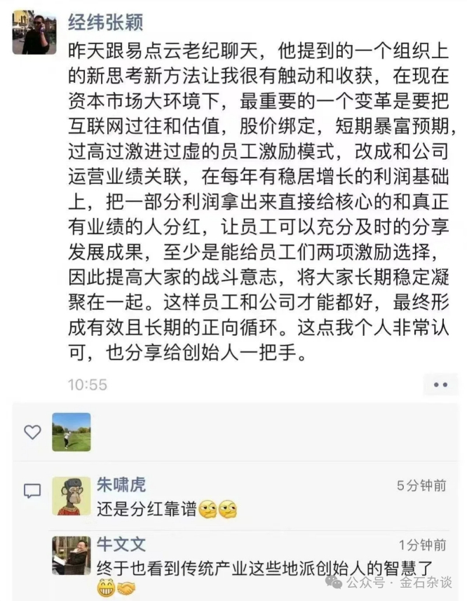 不过,张颖这次的观点,虽然没提一级投资人们怎么实现良性退出。但却说了企业如何良性发展,那就是给员工分红,不要给员工股票。所以,大家感觉张颖本次观点和朱啸虎一级投资人分红退出的观点是殊途同归吗?