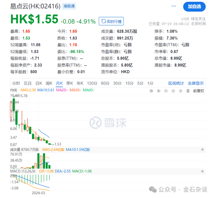 所以,大家发现易点云上市以来股价暴跌,发行价10.19港元,最高涨至16.44港元,但随后便是一地鸡毛,最新股价1.55港元,股价暴跌85%,市值只剩8.99亿港元,少了大约50亿。