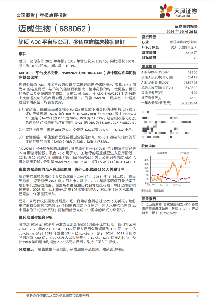 3) 未来展望UC适应症:单药治疗目前已经在III期临床快速入组阶段;联合PD-1治疗的III期临床年内有望获得准入;此外,公司计划尽快开展联合PD-1治疗肌层浸润性尿路上皮癌(MIUC)的临床申请,以拓展至更早期的肿瘤患者,潜在收益人群更多(EV目前在III期临床阶段);