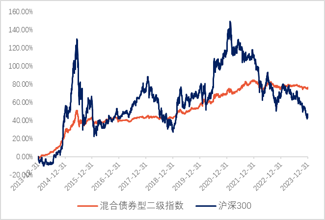 对于二级债基,大家想必并不陌生。但有一个数据或许会让大家惊讶:Wind混合债券型二级基金指数过去十年累计回报76.36%,而同期沪深300指数收益为47.26%。(数据来源:wind,截至2023.12.31,详见下文)