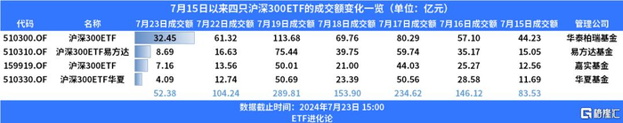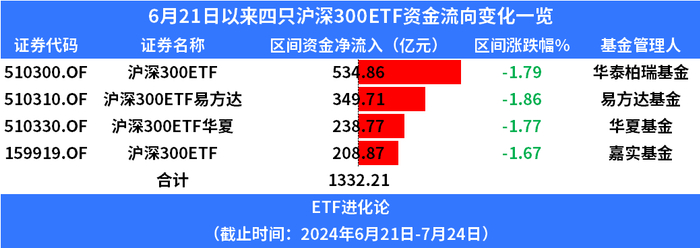 从6月21日至7月23日,华泰柏瑞基金沪深300ETF、沪深300ETF易方达、嘉实基金沪深300ETF和沪深300ETF华夏分别净流入534.86亿元、349.71亿元、238.77亿元和208.87亿元,合计净流入规模高达1332.21亿元。