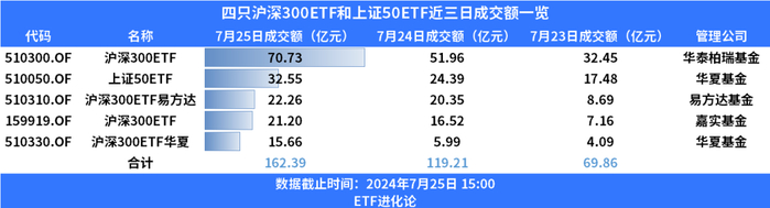 4只沪深300ETF午后成交额又激增,一举超过上午半天成交额。截至收盘,华泰柏瑞基金沪深300ETF、华夏基金上证50ETF、沪深300ETF易方达、嘉实基金沪深300ETF、沪深300ETF华夏成交额均超昨日,合计成交额为162.39亿元,超过119.21亿元。
