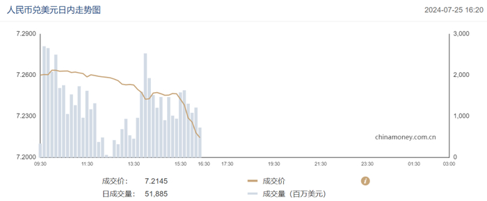 中国货币网数据显示,在岸人民币兑美元日内涨超400点,目前报7.2144。离岸人民币兑美元持续走高,日内累计涨500点,目前报7.2125。