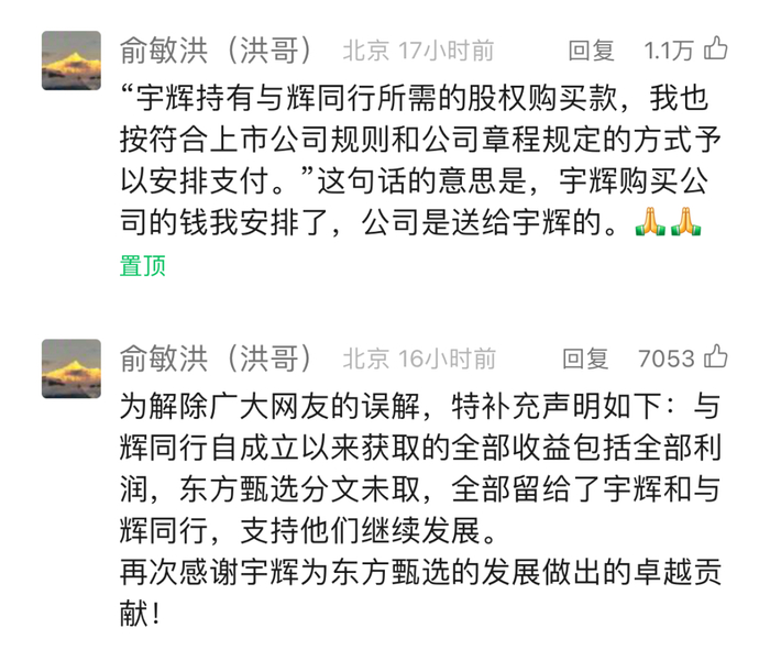 董宇辉和俞敏洪随后分别发布公开信,披露更多事件细节。俞敏洪称,董宇辉买公司的钱由他安排,公司是送给董宇辉的,把与辉同行的全部净利润留给宇辉和与辉同行。