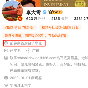 英大证券首席经济学家李大霄微博简介更新,变更为前券商首席经济学家。
