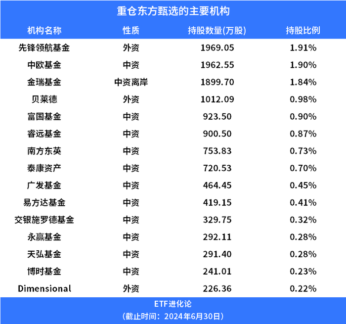 从机构投资者看,截至2024年上半年,东方甄选最大的单一机构股东是先锋领航基金,持股比例1.91%;中欧基金是第二大机构股东,持股比例1.9%;第三大机构股东金瑞基金,隶属于中金公司旗下,持股比例1.84%。贝莱德、富国、睿远、南方东英、泰康资产的持股比例也均超过了0.5%。