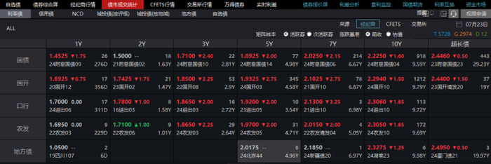 以利率债为例,红色代表的是涨,绿色代表的是跌,后面的数字自然是越大表示波动越大。然后纵轴国债、国开债、非国开债、地方债指的是债券类型,横轴指的是债券久期,一般来说1年内的债券产品我们称之为短债,1-10年是中长债,大于10年的就是超长债了。