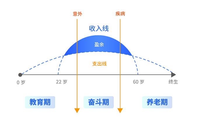 每个人都有一张“人生收支曲线”,从出生到终老,人生是一个漫长的消费过程,与之相对应的是,一般而言,人生赚钱的时期只有22岁至60岁之间的三十八年,年轻时的教育期、年迈时的养老期,一般没有收入或只有很少收入。赚钱时间很短暂,消费却是一辈子,这也提示我们要提前做好养老储备。