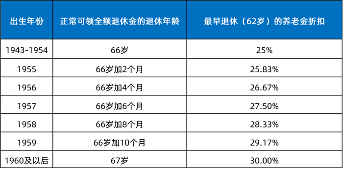在海外,弹性退休制也有较为完善的实践案例,比如在美国,就有最早退休年龄设计(62岁),且由于人均寿命的不断提升,越晚出生的人退休时间也会推迟,越早退休养老金打折越多,想要全额养老金必须到66-67岁退休,如下图所示,我国的弹性退休设计思路应大体如此。