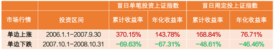 注:数据来源Wind定投计算器,上涨测算区间为2006.1.1-2007.9.30,单边下跌测算区间为2007.10.1-2008.10.31。单笔投资测算方式为区间首日买入,区间末日卖出所得的累计收益率。单笔投资收益率= (投资收益-投入总本金)/ 投入总本金×100%。年化收益率算法:根据计算周期(按日)在所选时间段内拆分出n个区间,年化收益率=[(1+当期收益率)^(365/计算周期天数)-1]*100%。定投收益通过上证指数(000001.SH)测算,定投方式为自测算区间首日起每周定投,不考虑申赎手续费,分红方式以红利再投资进行测算,定投收益率=(期末总资产/投入总本金-1)*100%。模拟方法说明:测算标的为上证指数(000001.SH),定投计算公式M=[ (a1/指数点位+······+an/指数点位)*定投截止日指数点位-a*n]/a*n。其中,M为定投收益率,a为定投金额,n为定投期数。定投时间区间选取有一定主观性,以上测算仅作示例,不作为收益保证或者投资建议;所引用指数在特定期间的收益率表现不能代表我公司旗下基金现在或未来的收益表现。