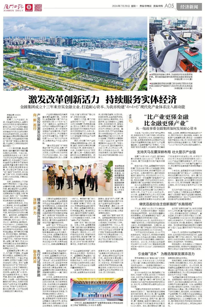 7月29日,《厦门日报》刊发新闻,聚焦报道金圆集团成立十三年来,夯实金融主业,打造耐心资本,为构建现代化产业体系注入强劲动能。