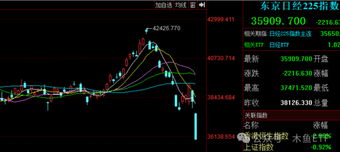 日本股市,本来就因为加息波动,现在加上美国经济衰退导致资本撤离,更是一泻千里。周五收盘大跌5.81%,其跌势之猛着实令人咂舌。