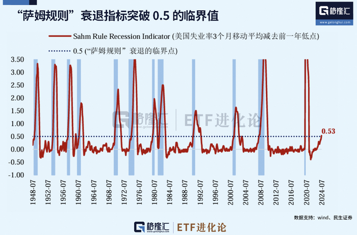 8月2日晚的非农数据再次给市场当头一棒。失业率环比上行0.2%至4.3%,触发“预测经济衰退准确率高达惊人100%”的萨姆规则,即三个月平均失业率比过去12个月的最低值高0.5个百分点意味着美国经济进入衰退。