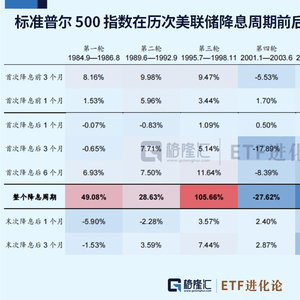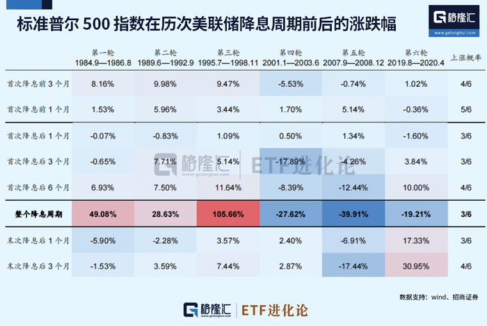 从1984年9月以后的六次降息周期来看,标普500指数期间的表现属于55开,三次下跌,三次上涨。