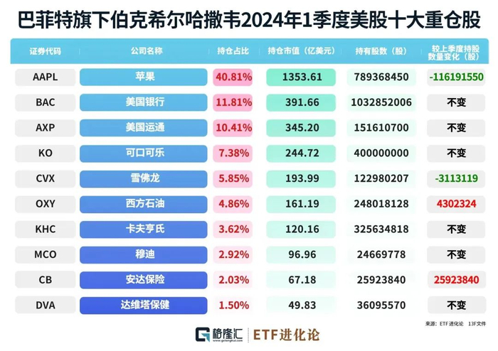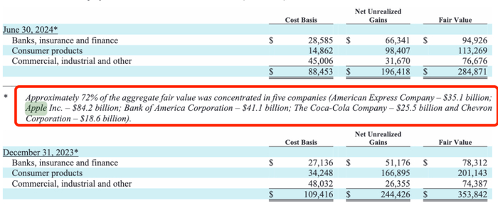 伯克希尔·哈撒韦2024年第二季度财报显示,截至6月30日,股权投资的总公允价值中,72%集中在五大公司,分别是苹果(842亿美元)、美国银行(411亿美元)、美国运通(351亿美元)、可口可乐(255亿美元)和雪佛龙(186亿美元)。