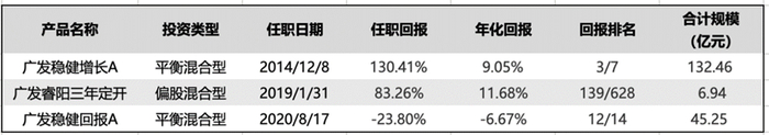 除了广发稳健增长,傅友兴目前还管理了2只基金产品,广发稳健回报、广发睿阳三年定开,分别在2019年1月、2020年8月接手,目前任职回报分别为83.26%、-23.80%。