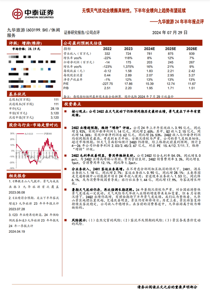 答:根据九华山风景区管委会公布数据,2024年上半年九华山风景区共接待游客547.63万人次,同比增长10.33%;实现旅游收入61.68亿元,同比增长9.04%。公司上半年实现营业收入3.95亿元,同比增长3.92%,实现归属于上市公司股东的净利润1.14亿元,同比增长2.65%,其中二季度实现营业收入2.15亿元,同比增长14.17%,实现归属于上市公司股东的净利润6,221.80万元,同比增长25.70%。2024年下半年如延续上半年游客增长趋势,公司有望实现全年目标任务。