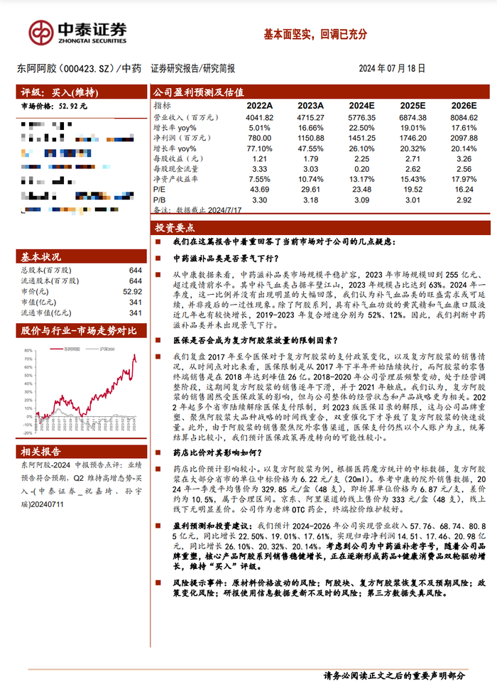 2024年1-6月,公司产品营收结构占比发生一定变化,东阿阿胶块占比有所下降,复方阿胶浆占比逐步提升,桃花姬阿胶糕占比保持稳定,公司各产品均实现稳健良性发展。