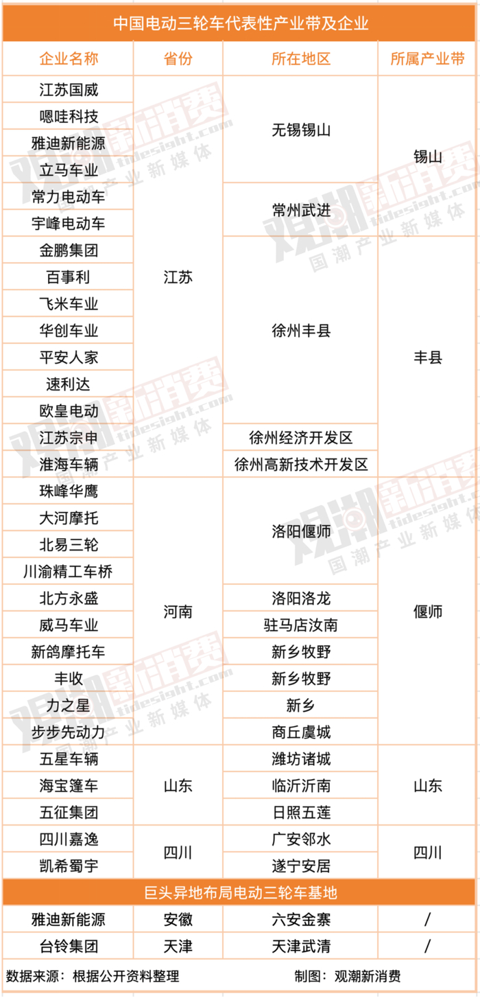 在国内,电动三轮车的产业带与摩托车及电动自行车的产业带多有重合,很多企业涉及其中多项业务布局。其中,江苏无锡锡山/徐州丰县、河南洛阳偃师最具代表性,此外还有四川遂宁安居、山东及天津多地等。锡山是电动自行车产业延伸的代表,在这里聚集着雅迪、新日、台铃、小刀等众多电动两轮车巨头;偃师则有不少企业是从摩托车厂家拓展而来,因而出口产品中不只有轻型电动三轮,还有很多重型的燃油三轮。