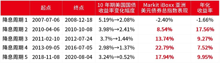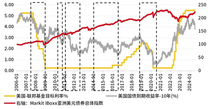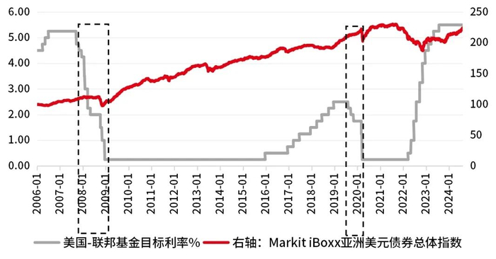 注:Markit iBoxx亚洲美元债全总指数基日为2005/12/31,仅能覆盖最近两次美联储降息周期。