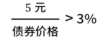 理论上只要票息率高于3%这一市场平均水平,A债券对于投资者就是有吸引力的。由于A债券的利息是固定的每年5块钱,代入这个公式以后就变成了