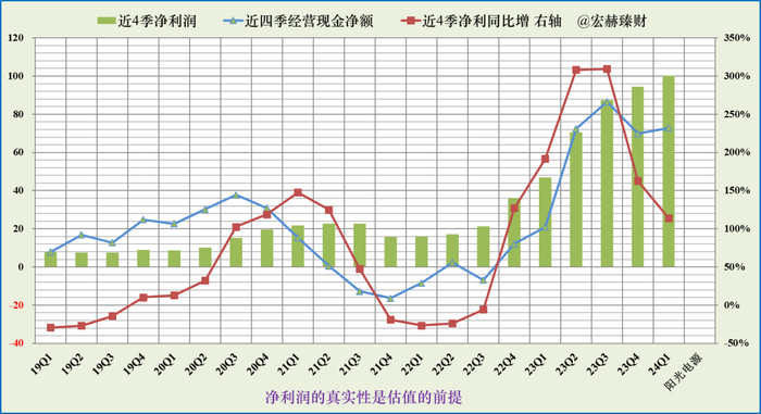 蓝色折线持续在绿色柱图上边及以上,显示净利润含金量高。