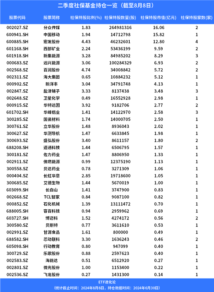 截至8月9日,目前已披露信息显示,今年二季度社保基金现身36只个股前十大流通股东,合计持股8.38亿股,合计持股市值达118.23亿元。