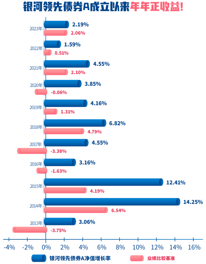 业绩数据来源:银河领先债券定期报告。银河领先债券成立于2012年11月29日,2023年01月16日新增C类份额。2023年C类净值增长率2.42%,同期业绩比较基准收益率为2.06%。银河领先债A业绩比较基准:中债综合全价指数。