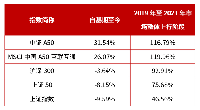 Wind数据显示,自基期至今,中证A50指数实现了31.54%的累计涨幅。相比之下,同期MSCI中国A50互联互通指数累计上涨26.07%,沪深300和上证50则分别下跌3.64%和8.15%。此外,在2019年至2021年市场整体上行的阶段,中证A50区间涨幅达116.79%,表现出较强的进攻性。
