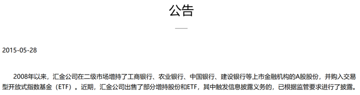 除了这两次外,2015年股市异常波动期间,中央汇金针对ETF的交易同样发布了三则公告,发布时间分别是5月28日、7月5日和7月8日,这三个公告的后两则是增持ETF,不再赘述。
