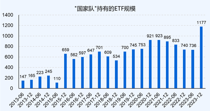 下图列出了中央汇金投资有限责任公司和中央汇金资产管理有限责任公司两个持有人主体在2023年年报及之前各期持有的ETF总金额情况。可以看到2023年及之前汇金对ETF增持规模最大的两次分别是股灾和去年下半年,每次增持的规模均差不多在500亿元左右。