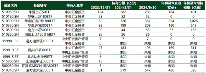 尽管季报不会披露前十大持有人详细信息,但会披露“报告期内单一投资者持有基金份额比例达到或超过 20%的情况”,换言之,对于那些持有比例超过20%的持有期间的行动情况会做额外披露,由于中央汇金持有不少ETF的比例超过了20%,那么其在这个季度的申赎情况也会被呈现出来。