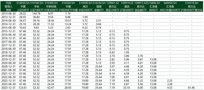 2023年及之前汇金公司各期持有的ETF及份额