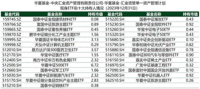下表列出了中央汇金投资有限责任公司和中央汇金资产管理有限责任公司两个持有人主体在2023年年报及之前持有过的所有ETF及其各期持有份额情况。