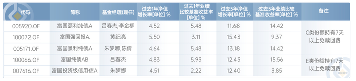 中长期纯债:富国纯债、富国强回报、富国颐利纯债、富国投资级信用债、富国景利纯债等。基金定期报告数据显示,截至2024年6月30日,这几只中长期纯债近1年收益率水平均在4.5%以上,近3年收益率超11%。