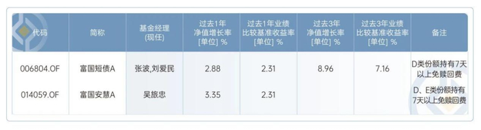 注2:富国安慧短债债券A成立于2022/06/15,业绩比较基准为中债综合财富(1年以下)指数收益率*80%+银行一年期定期存款基准利率(税后)*20%。近1个完整年度(2023)的基金份额净值增长率(及同期业绩比较基准收益率)为3.71%(2.41%),数据来自基金定期报告,截至2023/12/31。期间基金经理变动情况:张波(2022/06/15至今)、吴旅忠(2022/12/15至今)。基金历史业绩不构成对未来业绩的保证。
