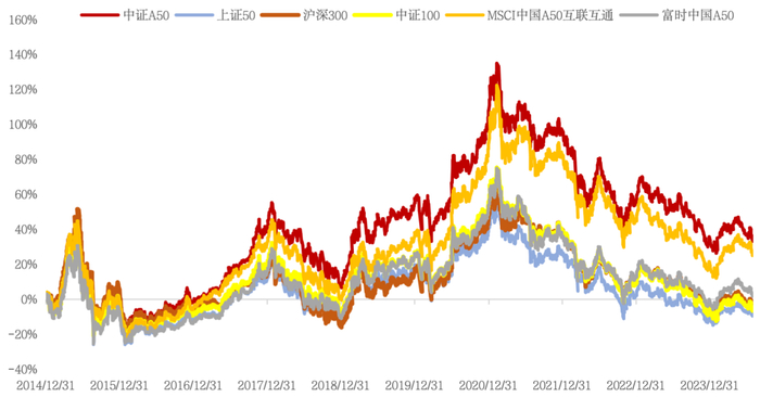 图:主要宽基指数及“50”系列指数历史走势比较