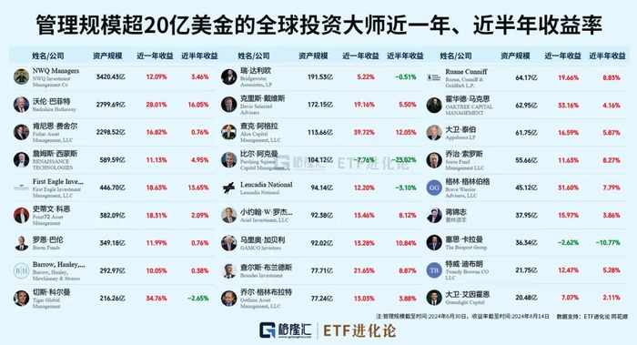 美股近几年持续走牛,管理规模超20亿美金的全球投资大师中,超92%近一年收益率为正,超81%近半年收益率为正。