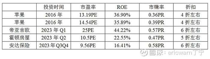 实际上,就在刚刚发明市赚率之后的两年时间里,验证的机会就立刻出现了。在那两年里,巴菲特把苹果买成了第一重仓股。2016年,买入市盈率是13.19PE,当年ROE为36.90%,市赚率估值0.357PR。2017年,买入市盈率是14.54PE,当年ROE为36.89%,市赚率估值0.394PR。两年平均下来,约等于0.4PR,刚好符合巴菲特4折5折6折的买股习惯。在此之后,巴菲特又买入的帝亚吉欧、霍顿房屋、安达保险等众多投资案例,仍然符合4折5折6折的买入标准。也就是说,市赚率的演绎法胜率曾经高达100%!