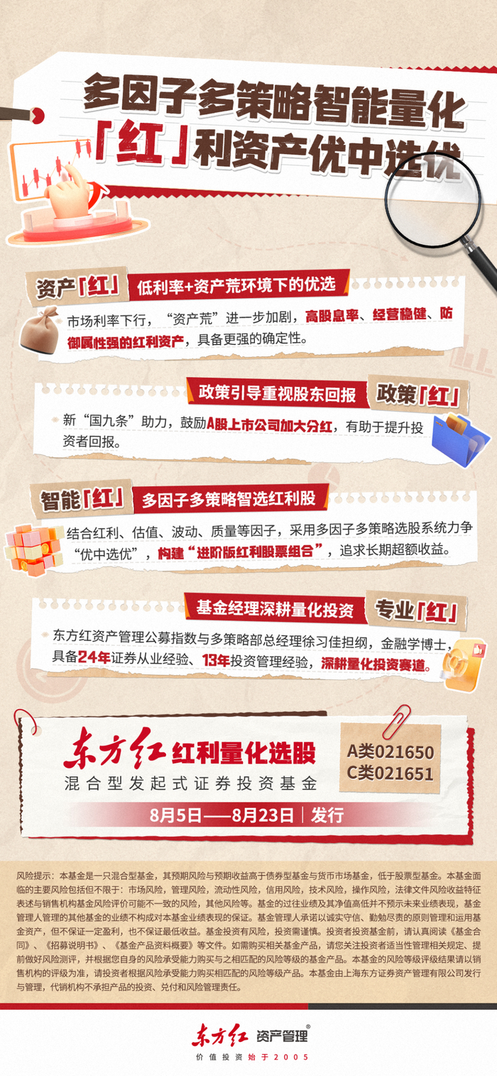 8月5日至8月23日,东方红红利量化选股混合发起基金(A类:021650,C类:021651)发行,重点关注红利主题相关上市公司的投资机会,通过基本面量化方法优选个股构建投资组合。