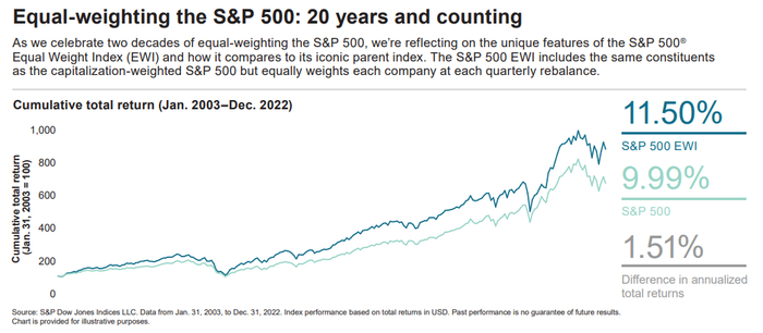 在2003/1/31-2022/12/31这个区间内,标普500EWI领先了标普500指数本身,平均每年年化领先1.51%。